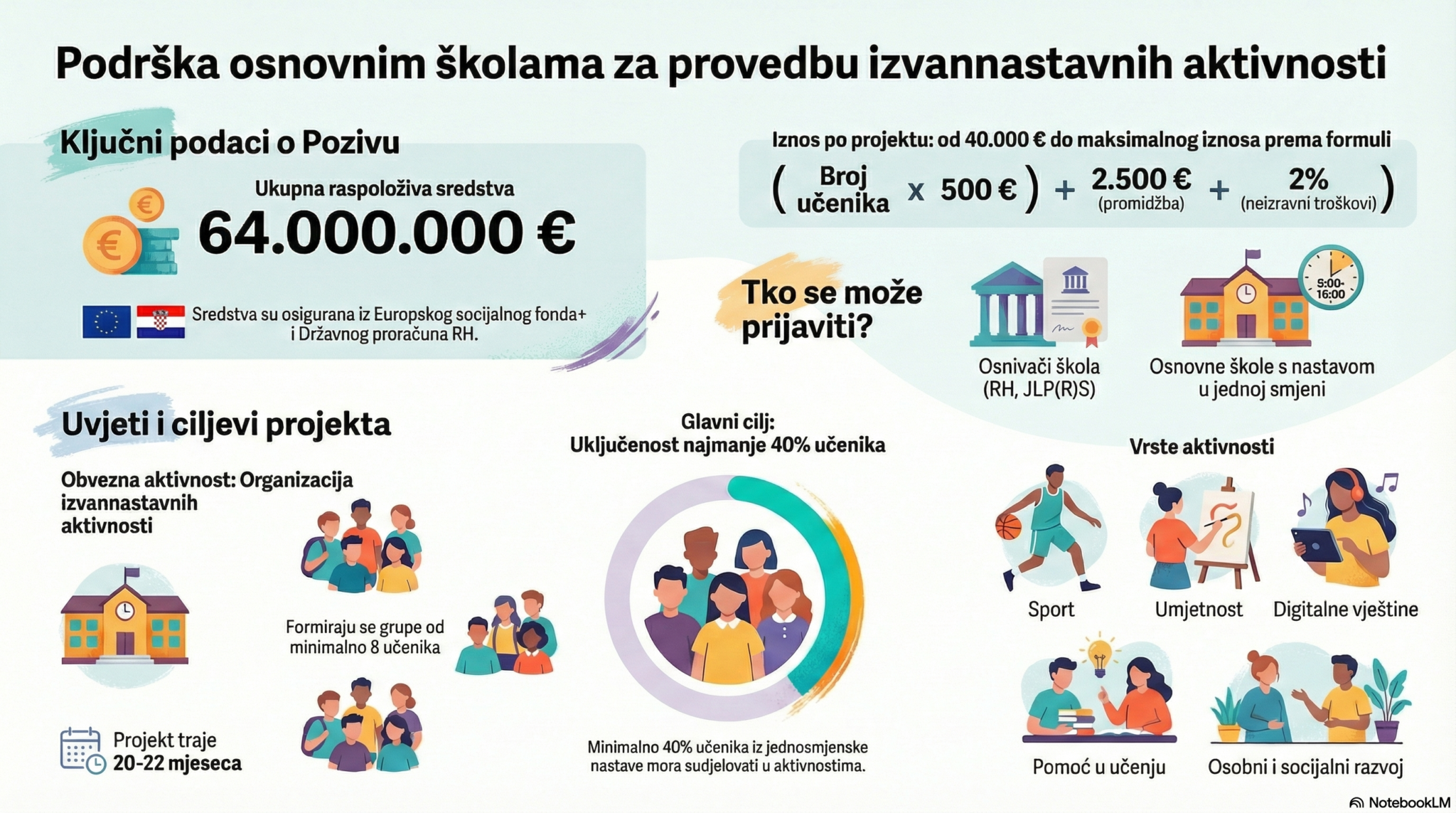 Ministarstvo znanosti, obrazovanja i mladih je 23. prosinca 2025. godine objavilo Poziv na dostavu projektnih prijedloga SF.2.4.06.09. – ,,Podrška osnovnim školama za provedbu izvannastavnih aktivnosti za program cjelodnevne škole” koji se financira iz Europskog socijalnog fonda plus, u okviru programa Učinkoviti ljudski potencijali 2021.-2027.
