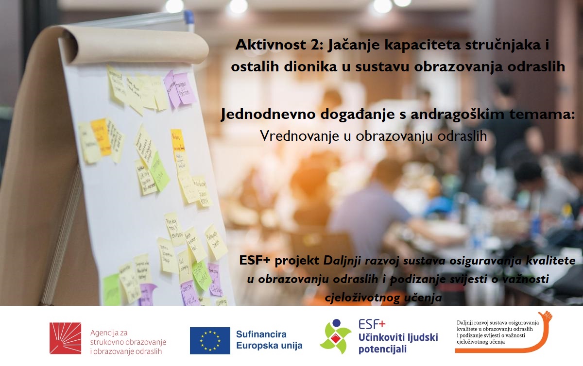 U sklopu ESF+ projekta Daljnji razvoj sustava osiguravanja kvalitete u obrazovanju odraslih i podizanje svijesti o važnosti cjeloživotnog učenja, u okviru Aktivnosti 2: Jačanje kapaciteta stručnjaka i ostalih dionika u sustavu obrazovanja odraslih, Agencija za strukovno obrazovanje i obrazovanje odraslih organizira radionicu na temu „Vrednovanje u obrazovanju odraslih“.
